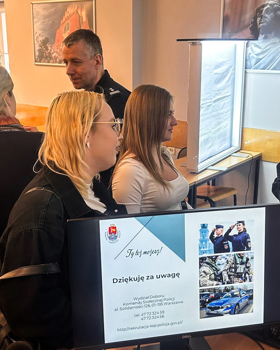 Podczas prezentacji nasi goście skupili się na kluczowych etapach wstąpienia w szeregi stołecznej Policji – od testów sprawnościowych po badania psychologiczne. Wskazali także, że praca w dynamicznym, warszawskim środowisku to dla ambitnych absolwentów nie tylko wyzwanie, ale przede wszystkim stabilna ścieżka rozwoju zawodowego.