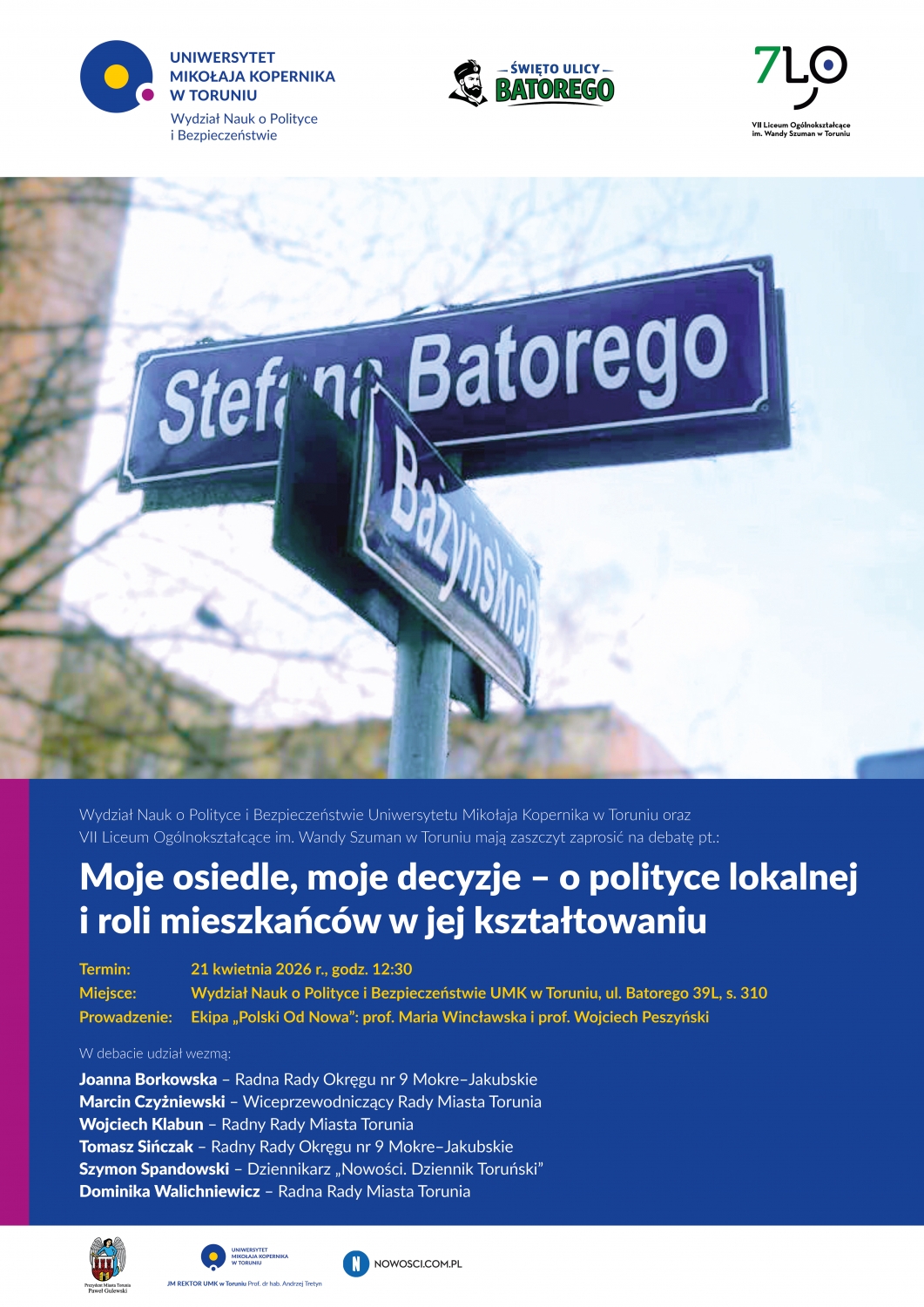 Wydział Nauk o Polityce i Bezpieczeństwie Uniwersytetu Mikołaja Kopernika w Toruniu wraz z VII Liceum Ogólnokształcącym im. Wandy Szuman w Toruniu zapraszają na debatę pt. „Moje osiedle, moje decyzje – o polityce lokalnej i roli mieszkańców w jej kształtowaniu”, organizowaną w ramach cyklu wydarzeń „Święto Ulicy Batorego – edukacja, bezpieczeństwo i wspólnota lokalna”.